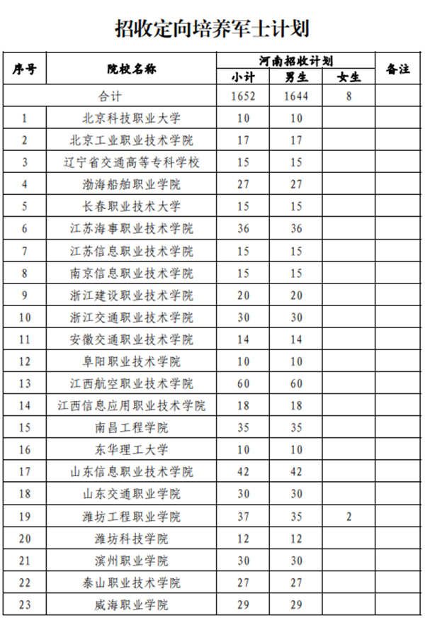 今年共47所高校在河南省招收定向培养军士1652人(含女军士8人)。计划附后,详见河南省教育考试院印发的《招生考试之友》。