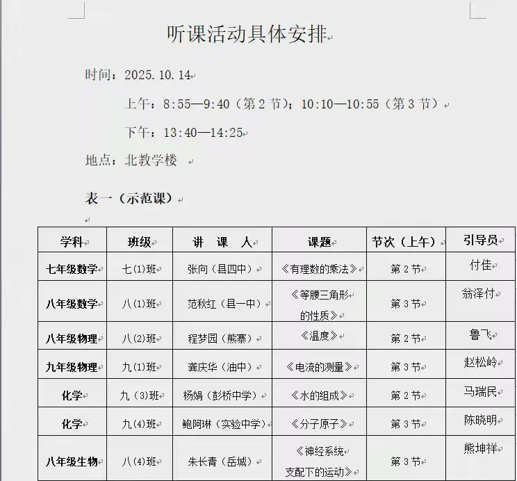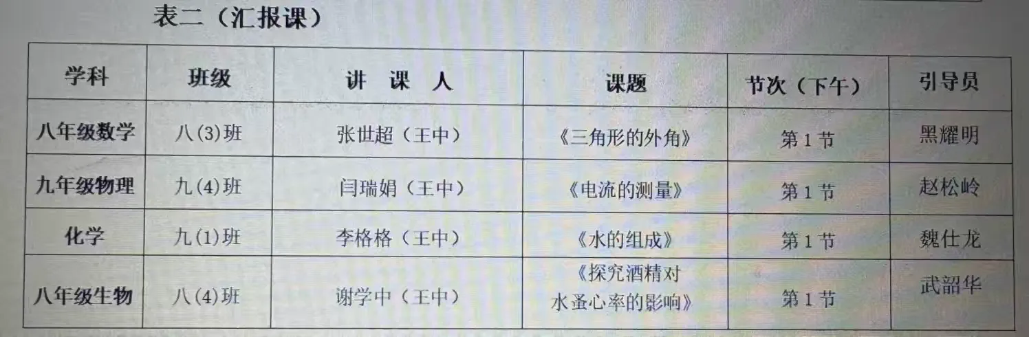 根据王勿桥中心学校听课活动安排,下午第一节分学科由“王勿桥中心学校教师”上汇报课。