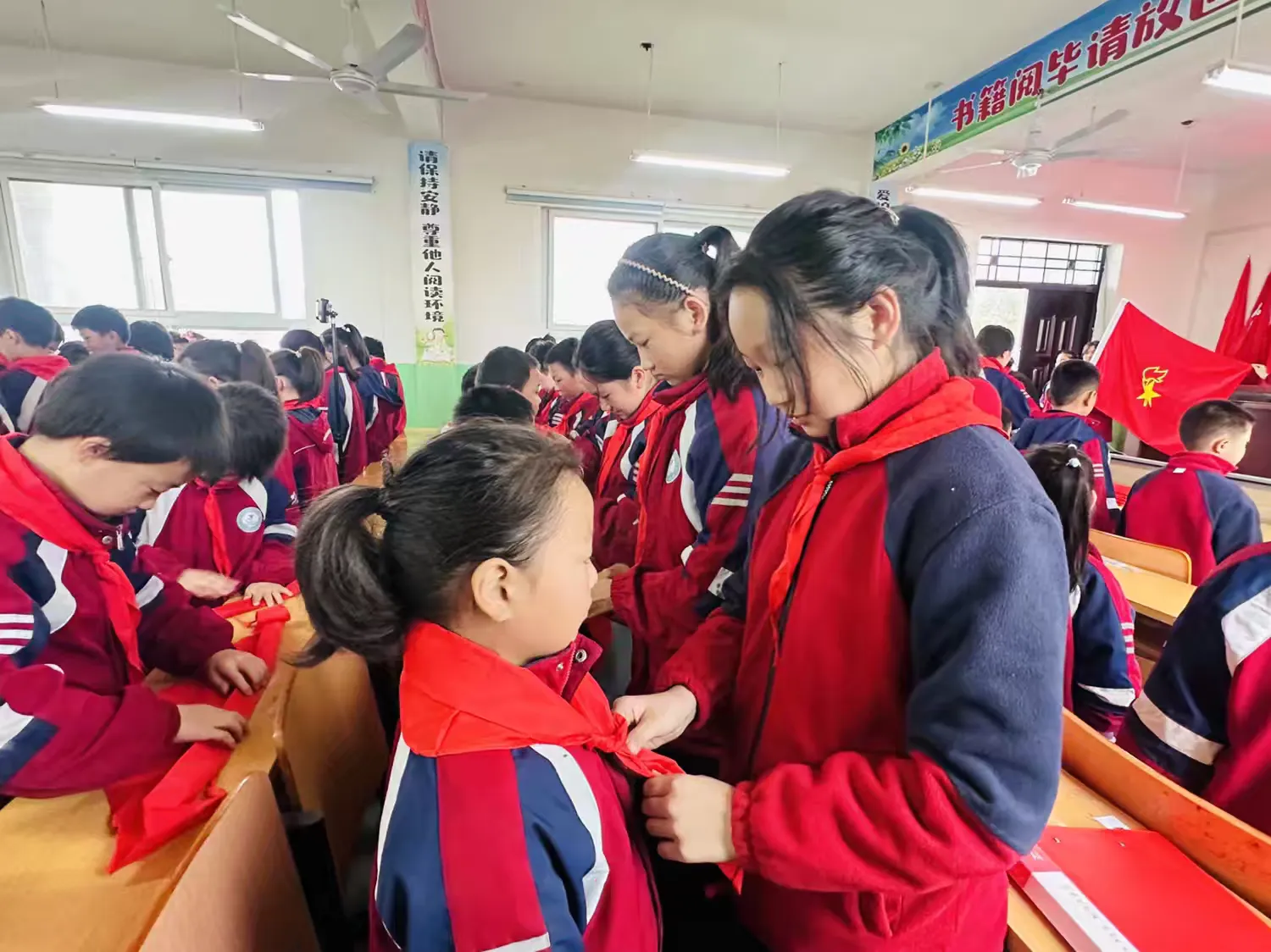 新队员代表怀着激动的心情走到台前,声音虽稚嫩却充满力量:“戴上红领巾,我就是党的孩子!今后我会好好学习、勇敢追梦,用行动践行‘强国复兴有我’的誓言!”真挚的话语,道出了全体新队员的共同心声,