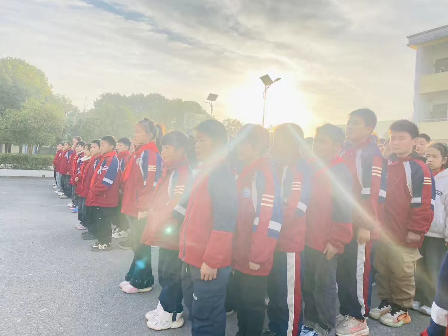 清晨的校园里,学生们身着整齐的校服,在操场列队站好。阳光洒在孩子们的脸上,大家神情庄重,等待仪式开始。队伍排列有序,展现出良好的精神风貌。